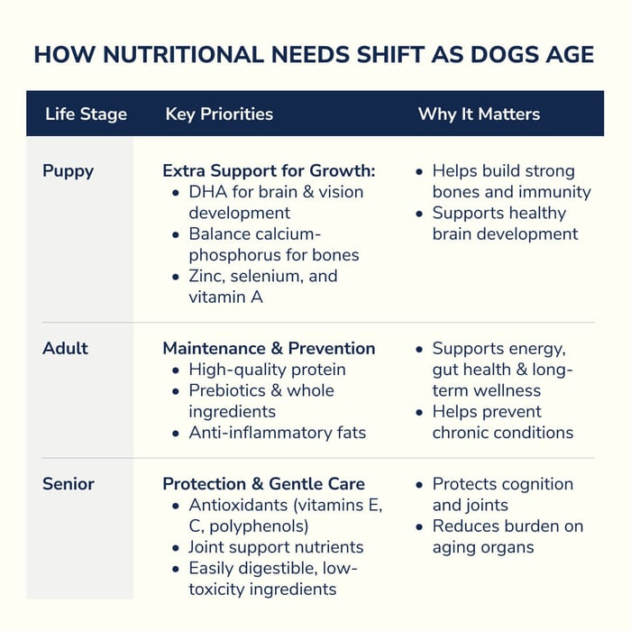 Dogs don’t have static nutritional needs. Their bodies are dynamic—growing, adapting, aging—and nutrition must grow with them.