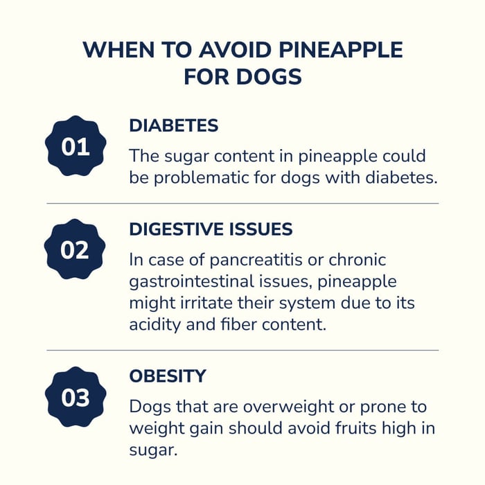 Although pineapple contains beneficial nutrients, it is also relatively high in natural sugars. If your dog is diabetic or prone to weight gain, pineapple should be given sparingly, as too much sugar can lead to blood sugar spikes or contribute to obesity.