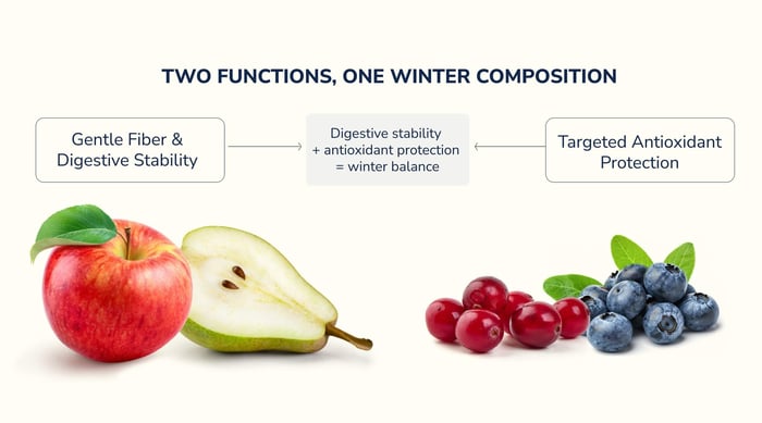 However, when fruits are used with intention, in small quantities and for a clear physiological purpose, they can play a supportive role. In winter, that role is not energy or variety, but digestive comfort, subtle hydration, and targeted antioxidant protection