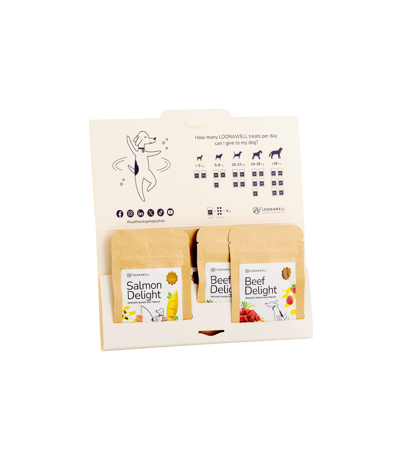 Erleben Sie die Essenz von Qualität in jedem Bissen mit unserem Welcome Pack Bio-Snacks für Hunde mit Lachs und Rind. Sorgfältig hergestellt und mit biologischen Zutaten zubereitet, verkörpert jeder Snack unser Engagement, Ihrem Hund das feinste und gesündeste Verwöhnerlebnis zu bieten.