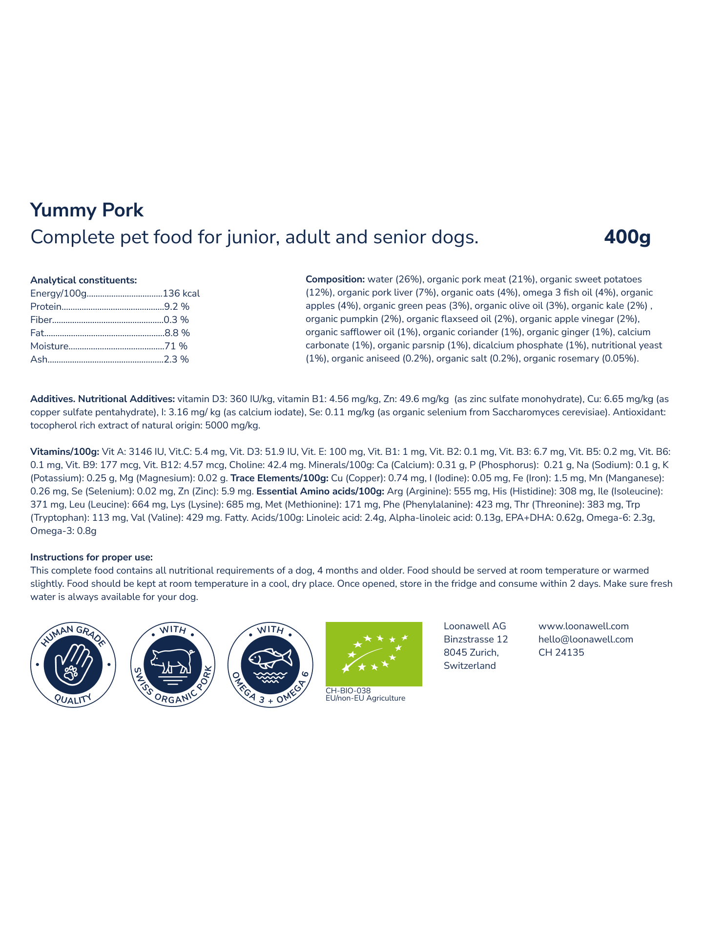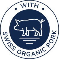 - Avec de la viande de porc biologique suisse (voir la liste complète des ingrédients ci-dessous)