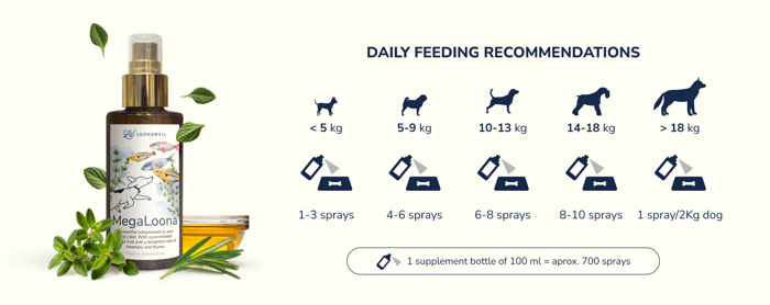 Poiché i cani non sono in grado di produrre da soli gli acidi grassi Omega-3, devono assumerli con la dieta. MegaLoona semplifica questo aspetto fornendo il 100% del fabbisogno giornaliero di Omega-3 in un comodo spray. Mescolato a crocchette, diete fresche, pasti cucinati in casa o BARF, garantisce una dieta completa e bilanciata per il vostro cane.