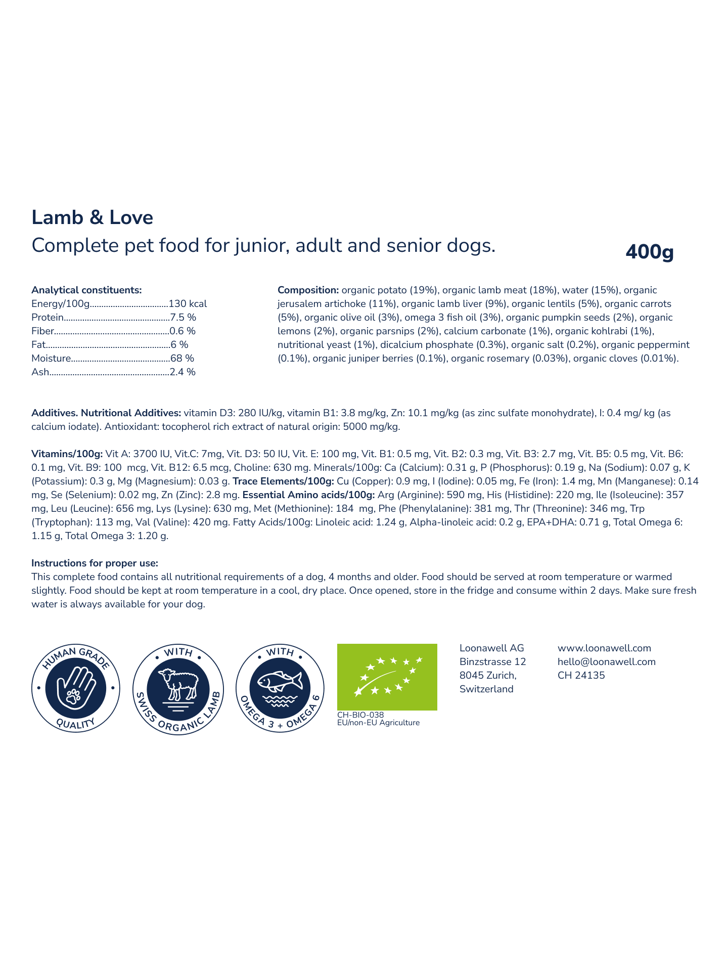 - Con agnello biologico svizzero, proveniente dal nostro partner Ueli Hof (per saperne di più sugli ingredienti, vedi sotto)