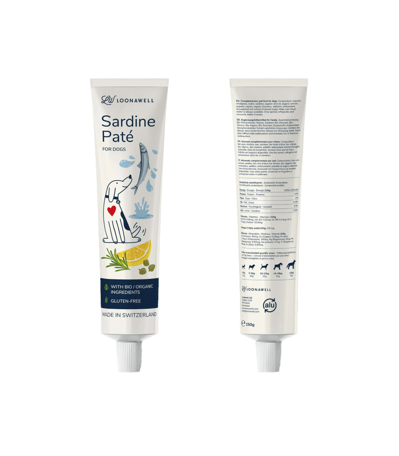 Il nostro paté di sardine orchestra una sinfonia culinaria, fondendo le note terrose del rosmarino con l'essenza oceanica delle sardine e il sapore piccante dei capperi. Questa fusione armoniosa e artigianale di sapori delizia i sensi del vostro cane a ogni boccone.