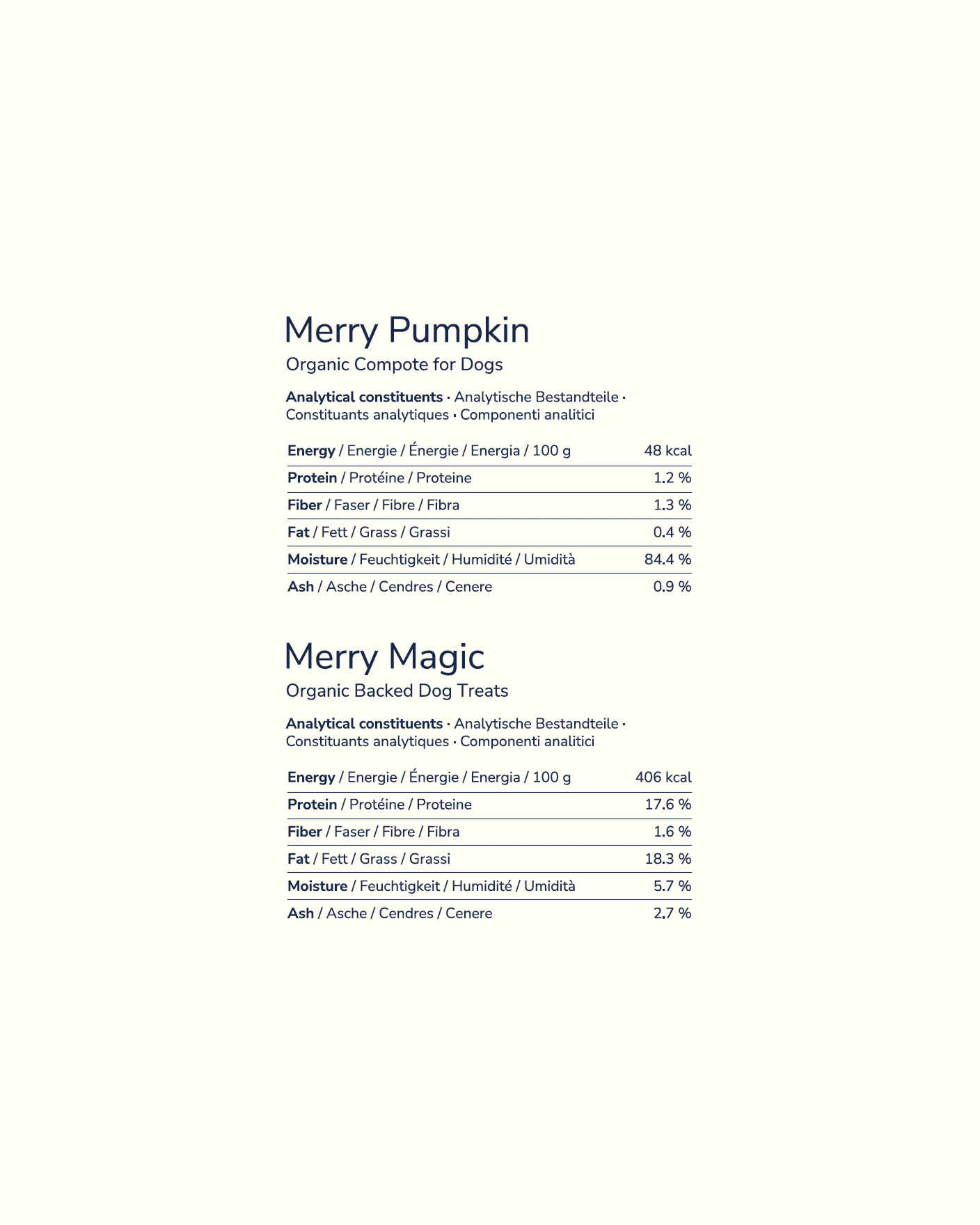 Merry Mix brings all the pleasure of a festive treat with none of the heaviness. Our Merry Pumpkin compote is naturally low in calories (48 kcal/100 g) and rich in moisture, offering flavour and nourishment without excess. Paired with our high-protein, oven-baked Merry Magic treats, this seasonal duo delivers a balanced moment of joy — wholesome, gentle on digestion, and perfect for dogs of all ages.
